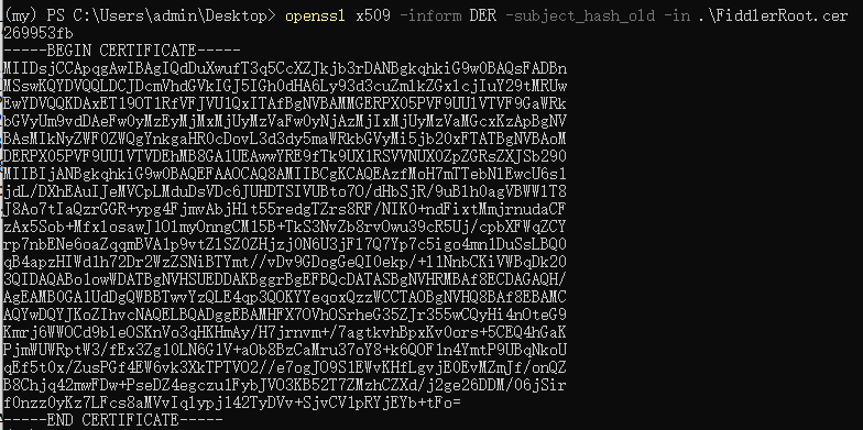 `openssl x509 -inform DER -text -in .\FiddlerRoot.cer > 269953fb.0`